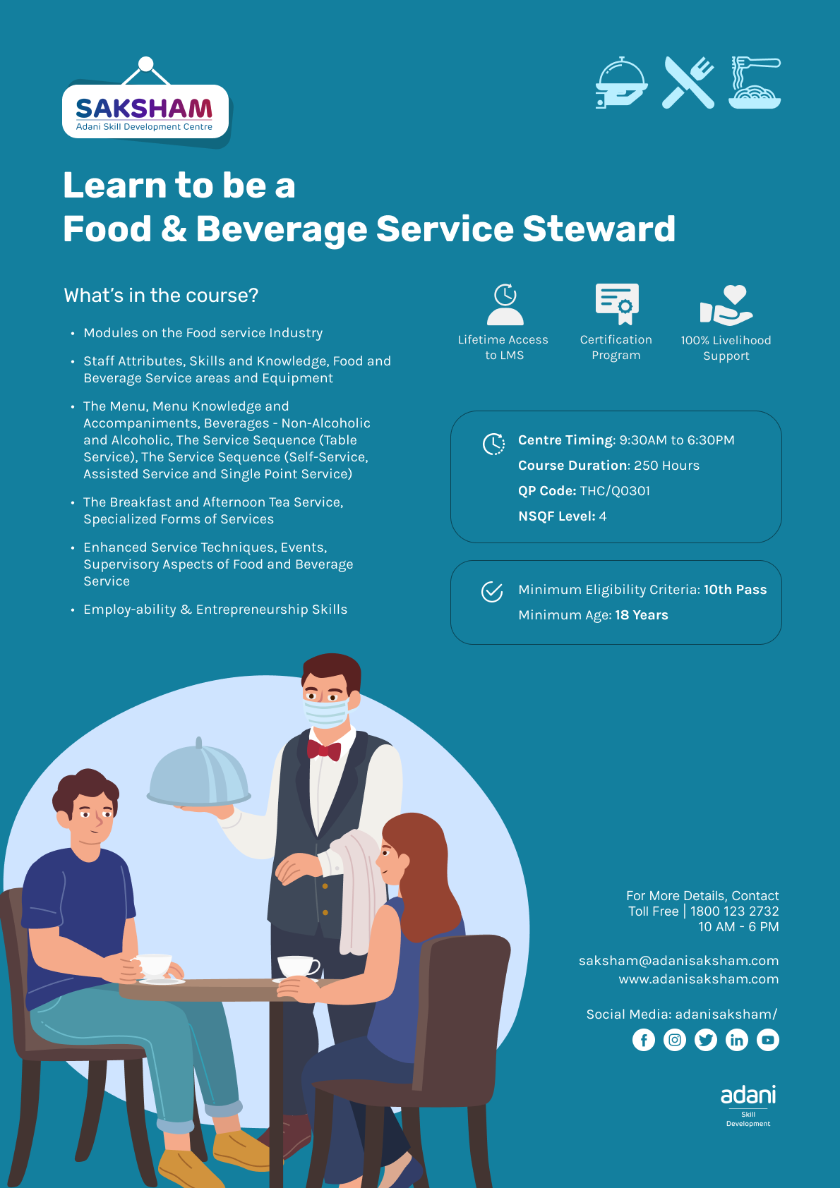 This program prepares learners for roles in cafes, restaurants, and hotels, focusing on food handling, service etiquette, and customer satisfaction. Learners gain practical skills in table service, order management, and hospitality operations.