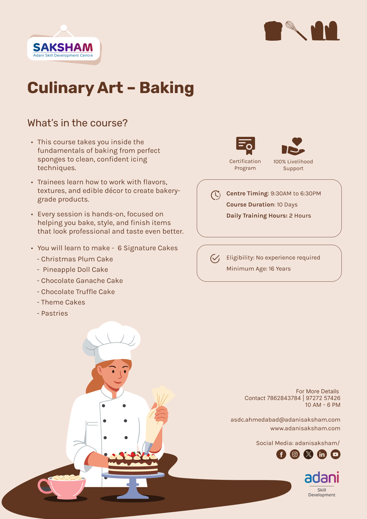 The Culinary Art – Baking program introduces learners to the fundamentals of professional baking and pastry preparation. The course focuses on hands-on skill development, helping learners master baking techniques, understand ingredients, and produce bakery products suitable for commercial kitchens, bakeries, and self employment opportunities.