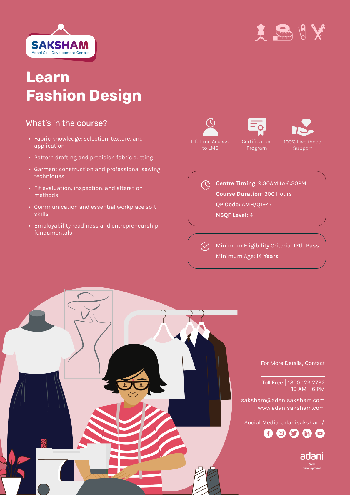 The Fashion Design & Technology program introduces learners to apparel design and garment production processes. The course combines creative design fundamentals with practical construction skills, preparing learners for roles in garment units, boutiques, or self-employment.