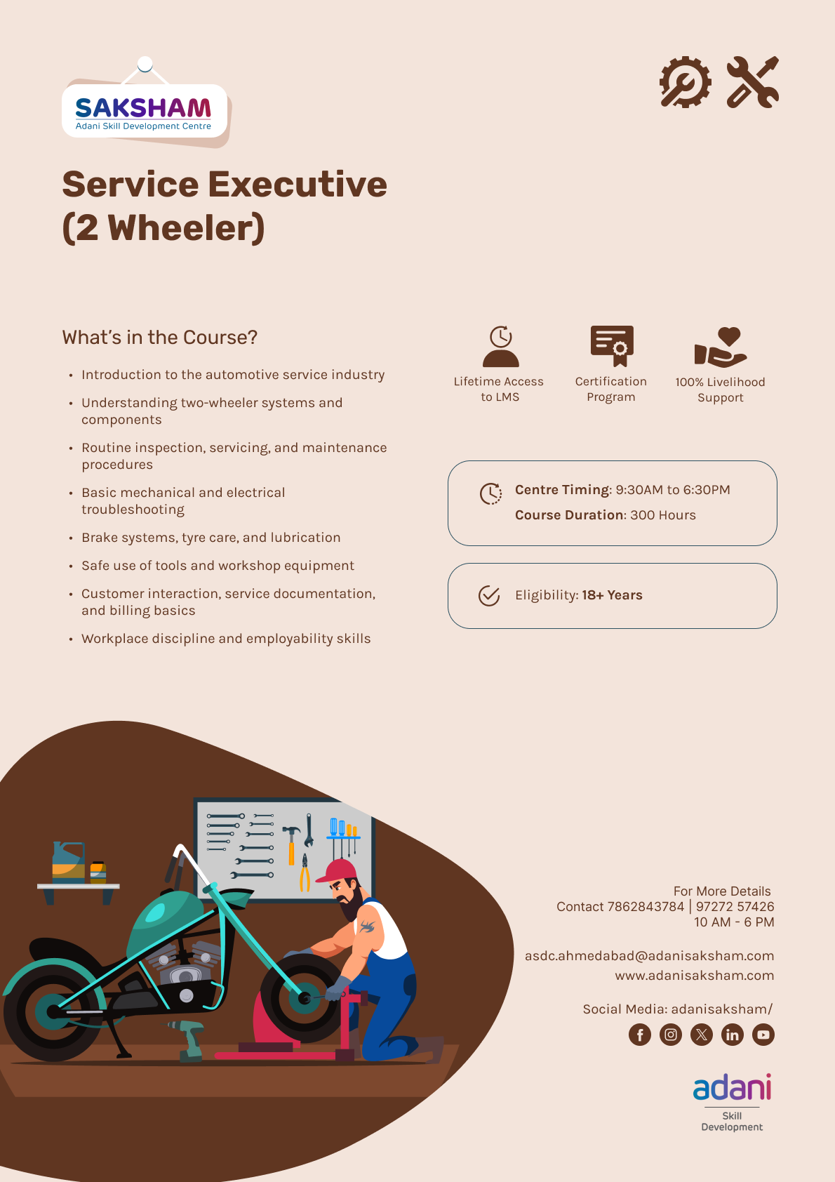 The Service Executive (2 Wheeler) program prepares learners to support routine maintenance and servicing of two-wheelers in workshops and service centres. The course focuses on practical skills, safety practices, and customer interaction required in an automotive service environment.